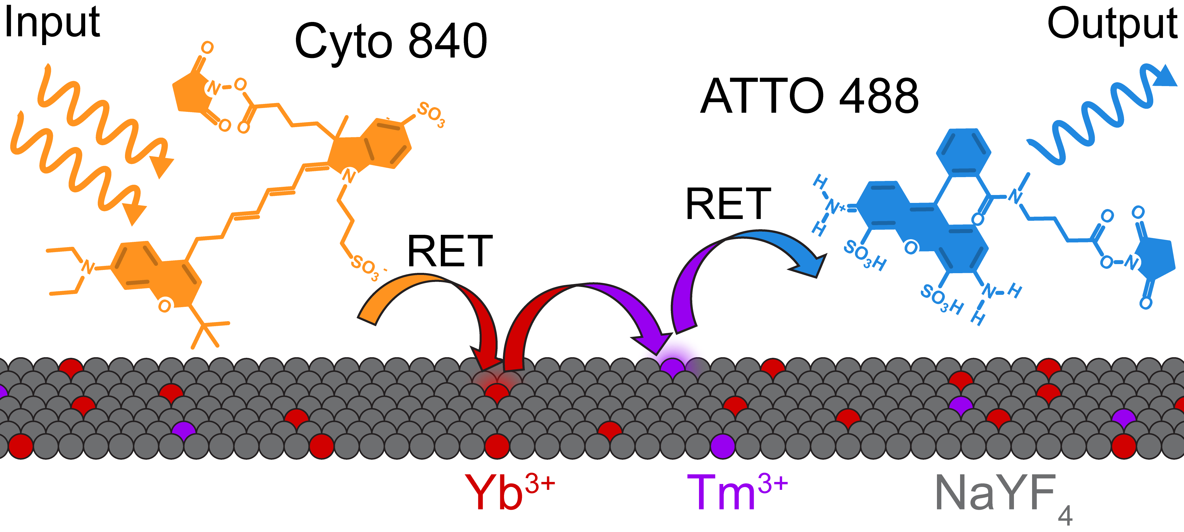 In an attempt to overcome this issue, I have developed the upconverting nanoparticle (UCNP) based RET relay to restore the energy of excitons as they transition from one RET network to the next. UCNPs typically take in multiple near-infrared (NIR) photons and emit visible light using a set of lanthanide dopants (usually Yb, Er, or Tm) embedded in a NaYF4 nanocrystal. The RET relay, composed of NIR and visible fluorophores adsorbed to the surface of a UCNP, leverages this dual-dopant upconversion system to convert multiple low energy excitons into a single high energy exciton. As shown in the figure above, operation of the device proceeds by first exciting the NIR fluorophore (Cyto 840). This generates low energy excitons (representing the output of upstream RET networks) that are transferred to the dopants of the UCNP via RET. After multiple transfer events, the dopants reach a highly excited state from which they can transfer a single, high energy exciton to the adsorbed visible fluorophore (ATTO 488). With further optimization, this proof-of-concept device will enable the cascading of independent RET networks by acting as an energy-restoring buffer.